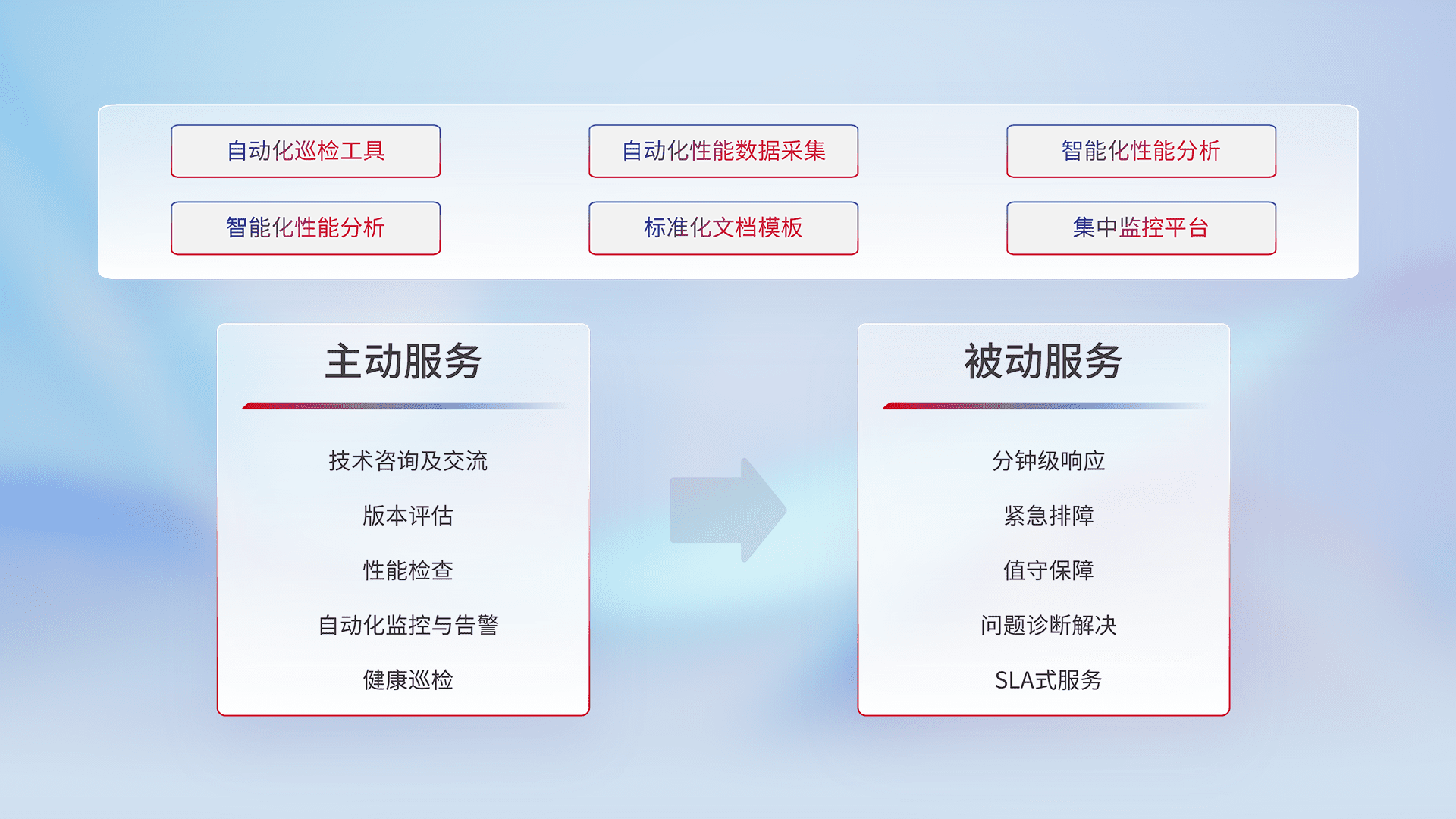 智能化工具和标准化文档,,,,保障服务质量,,,提供主动服务(包含技术咨询、、版本评估、、、、性能检查、、自动化监控与告警、、、、健康巡检)和被动服务包含(分钟级响应、、、、紧急排障、、值守保障、、、、问题诊断解决、、、、SLA服务)。。。。